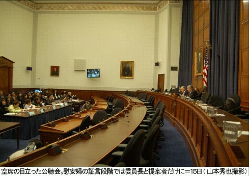 ◇聴聞会の意味・展望=この日の聴聞会は、ホンダ氏ら民主党議員5人とクリストファー・スミス氏ら共和党議員2人が先月31日、日本軍の慰安婦動員を非難して日本首相の公式謝罪を促す決議案(H.Res121)を提出したことを受けて開かれた。 議会消息筋は「この日の聴聞会で日本軍の蛮行実態が暴露され、日本政府の謝罪、釈明が偽りであることが明らかになったため、今後、決議案採択に前向きに作用するだろう」と述べた。 ホンダ議員は3月末までの決議案採択を目標にしている。 加藤良三駐米日本大使はこの日、アシア太平洋小委に書簡を送り、「日本はすでに慰安婦問題の責任を認め、韓国やフィリピン、台湾、インドネシアなど慰安婦被害者に補償もした」とし、決議案採択を阻止する意向を明確にした。